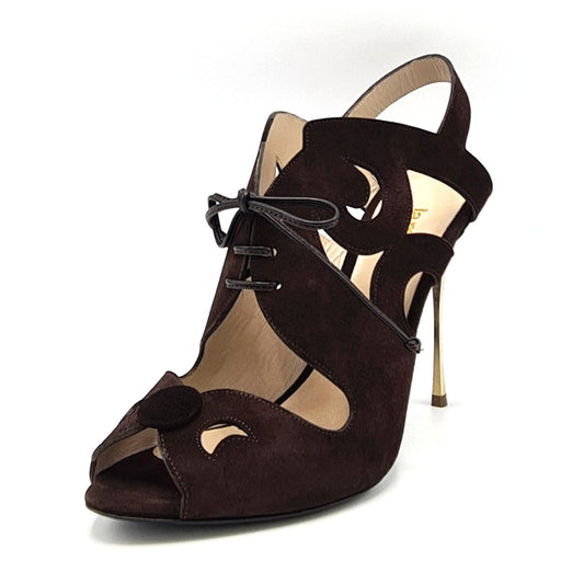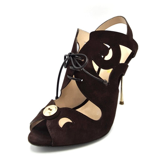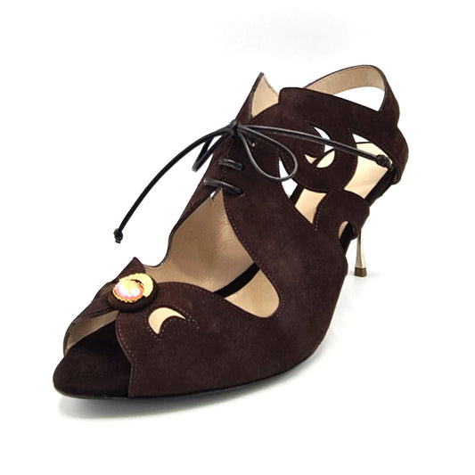 Sara: sandali in camoscio marrone con bottone bombè in tinta. Tacco alto in acciaio cromato oro. Tutto in vera pelle. Fatto a mano in Italia