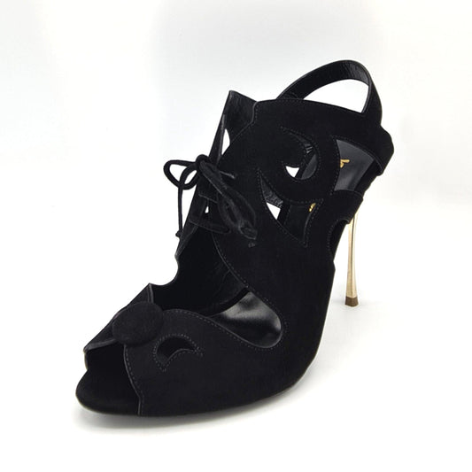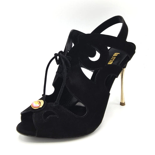 Giulia: sandali in camoscio nero con accessorio dorato e perla anticata. Tacco alto in acciaio cromato oro. In vera pelle. Fatto a mano in Italia