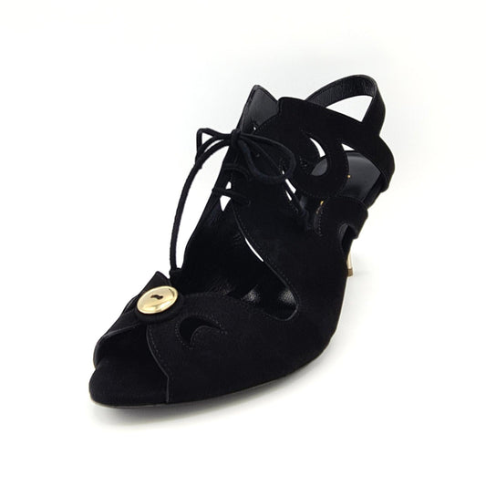 Elisa: sandali in camoscio nero con bottone dorato. Tacco medio in acciaio cromato oro. Tutto in vera pelle. Fatto a mano in Italia