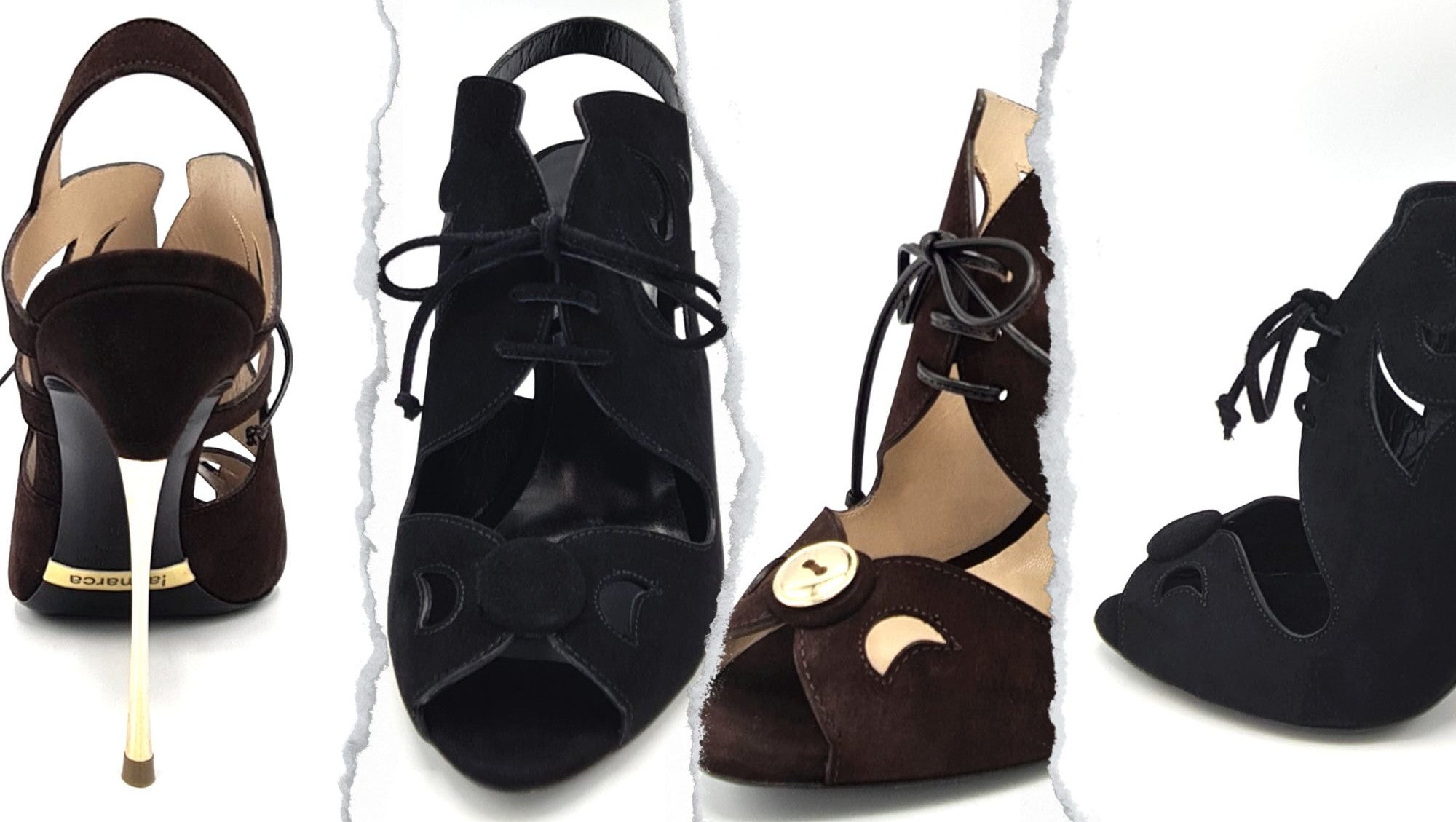 Claudia: sandali in camoscio marrone con bottone dorato. Tacco in acciaio cromato oro. Tutta vera pelle. Fatto a mano in Italia